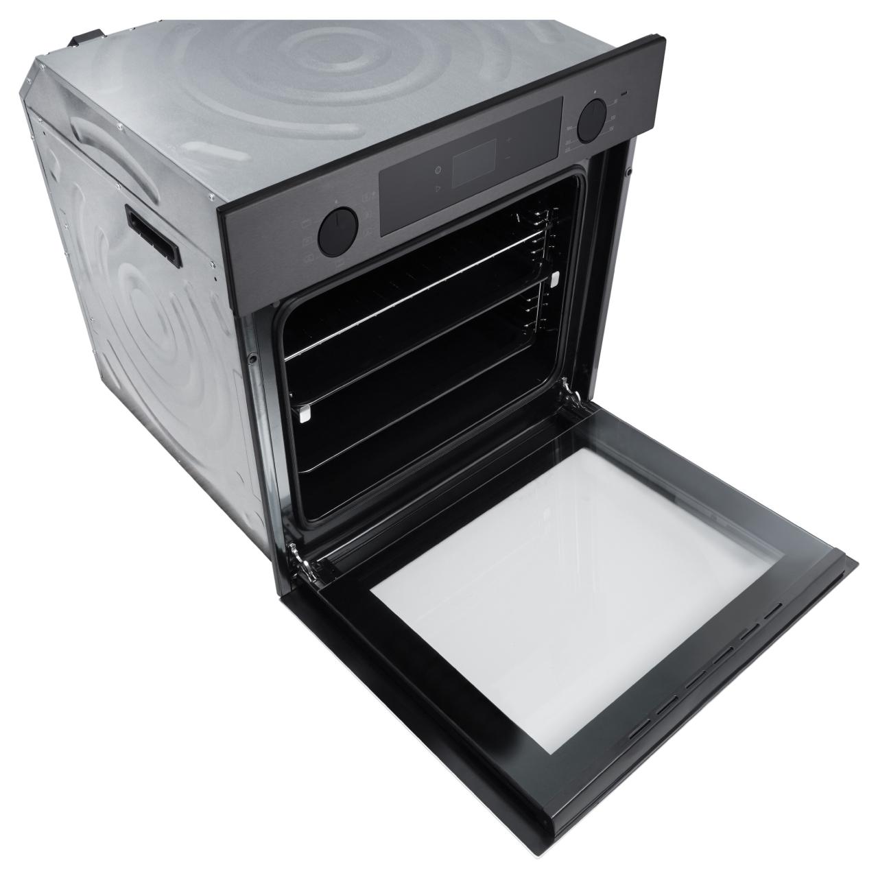 Управление осуществляется с помощью утапливаемых переключателей и сенсорного программатора, что делает процесс приготовления еды удобным и простым. Освещение духового шкафа осуществляется галогенной лампой, которая обеспечивает яркий и четкий свет. Оснащен дисплеем, который позволяет легко управлять всеми функциями устройства.