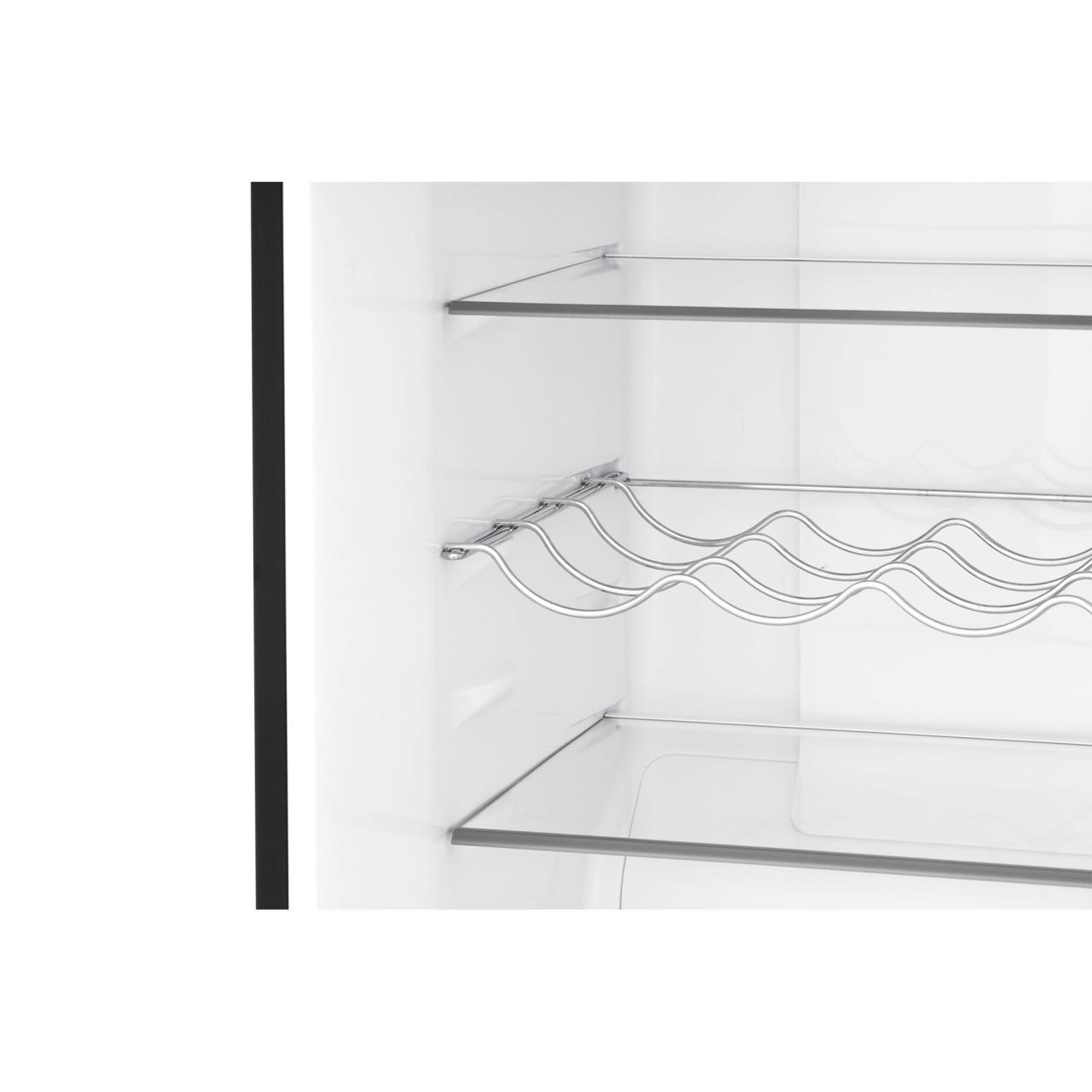 Холодильник воплощает в себе сочетание элегантного дизайна и функциональности. Стеклянные полки и глубокие прозрачные ящики создают удобное внутреннее пространство для хранения продуктов. Двери холодильника имеют возможность перенавешивания на другую сторону. Корпус модели — серебристого цвета. Высота холодильника — 185 сантиметров.