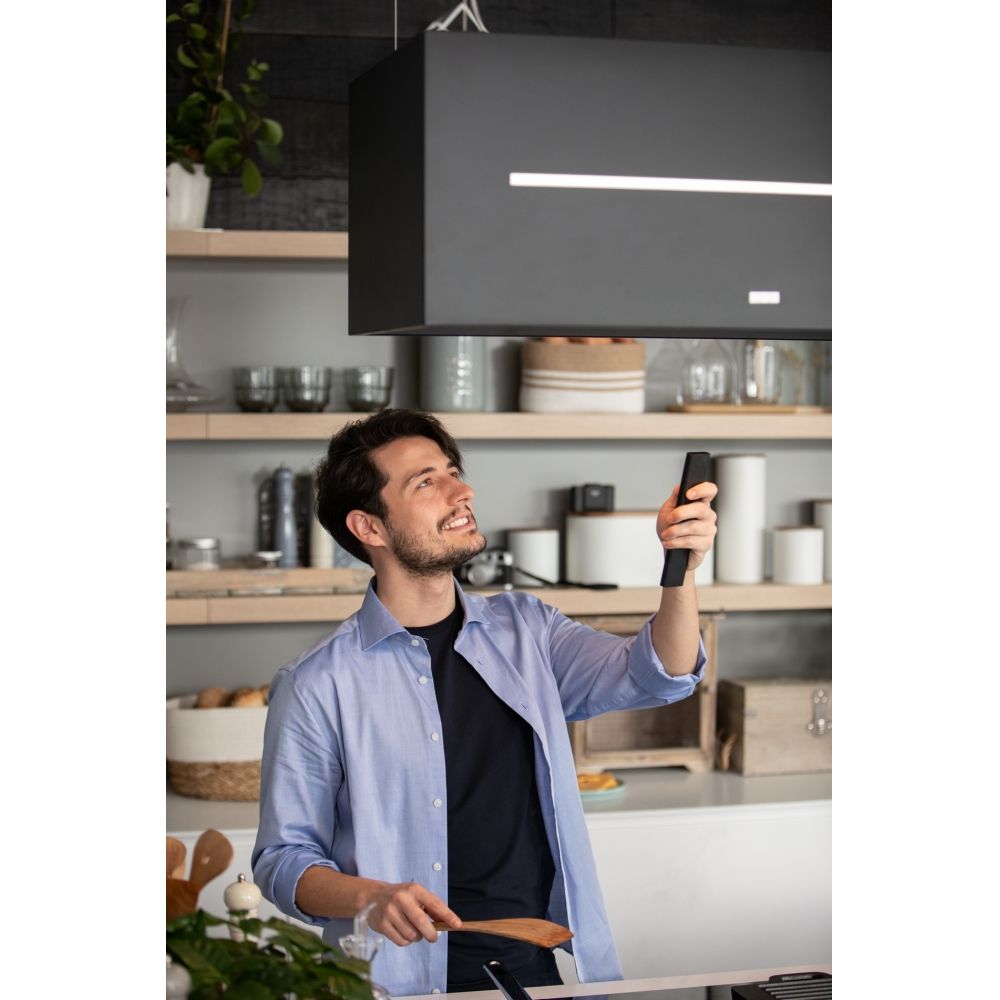 Благодаря технологии K-Link вытяжка синхронизируется с варочной панелью и автоматически подстраивает интенсивность всасывания. Для комфортного освещения рабочей поверхности установлены LED-подсветка и современный модуль освещения, а в комплект уже входят угольный фильтр и пульт дистанционного управления — можно пользоваться сразу «из коробки».