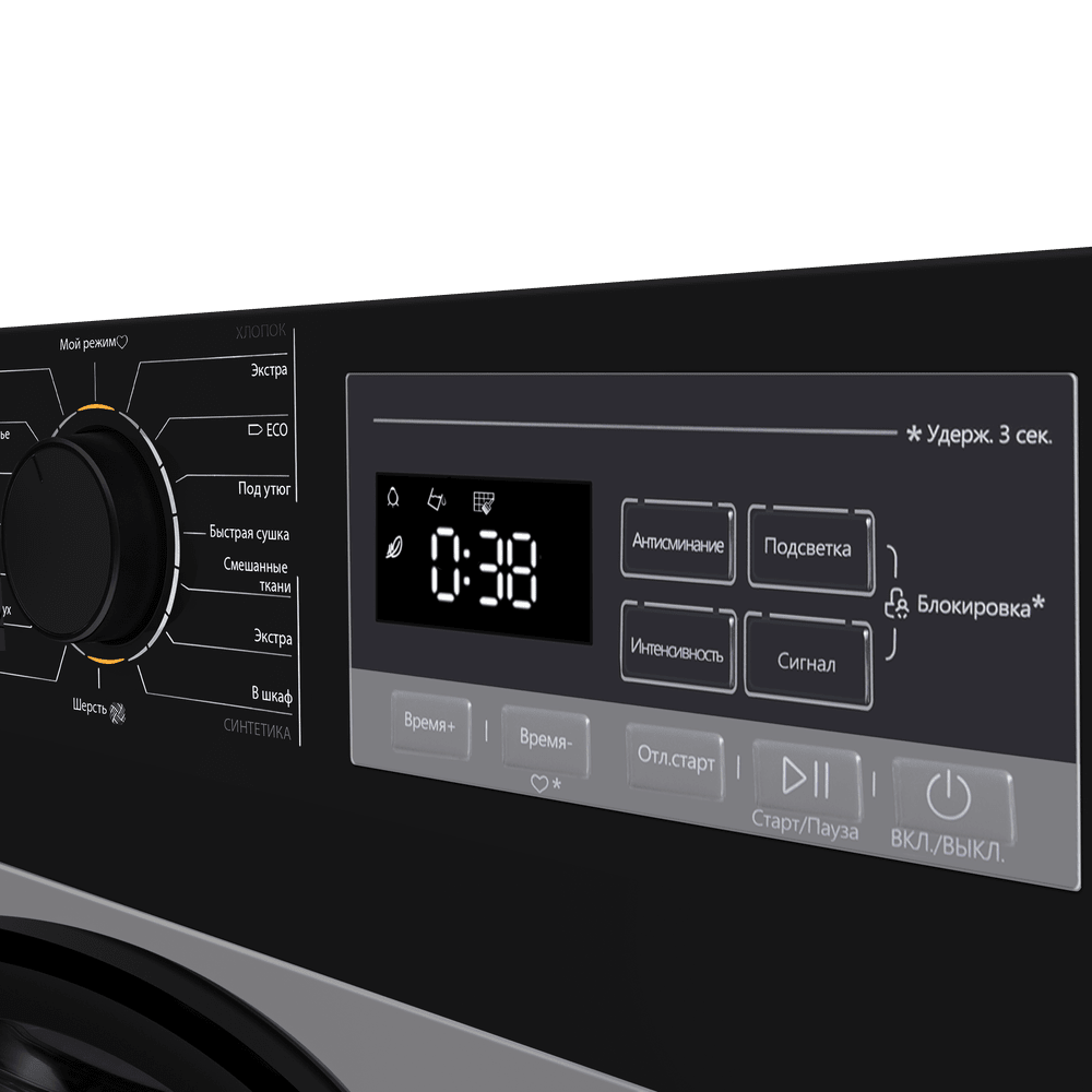 Комфорт в использовании дополняют продуманные детали: уровень шума 66 дБ делает работу тихой, режим «Антисмятие» облегчает последующий уход за одеждой, внутренняя подсветка улучшает обзор барабана, а блокировка от детей обеспечивает дополнительную безопасность.