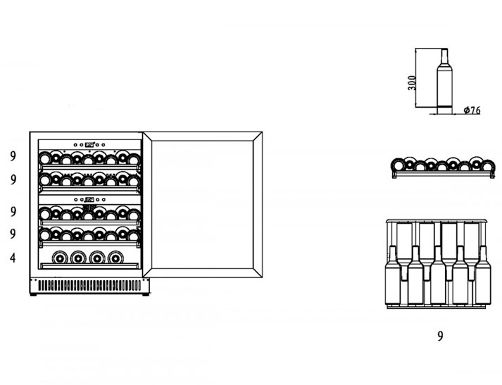 Пять съемных полок из дерева предназначены для правильного хранения вина: бутылки кладутся горизонтально (вместительность – 40 бутылок). Деревянные полки оборудованы фиксаторами от самопроизвольного выдвижения и компенсируют механические воздействия компрессора и вентилятора. Параметры холодильника задаются вручную, а также при помощи мобильного приложения «CASO-App». Возможна удаленная смена настроек из любой точки мира. Управление осуществляется при помощи двух сенсорных панелей.  Регулировка температурных показателей с шагом в 1°C происходит нажатием « ∧ » и «∨». Управление внутренним освещением возможно при помощи кнопки «Свет». Встроенные светодиоды не нагреваются, и внутренний микроклимат остается максимально благоприятным для хранения бутылок.