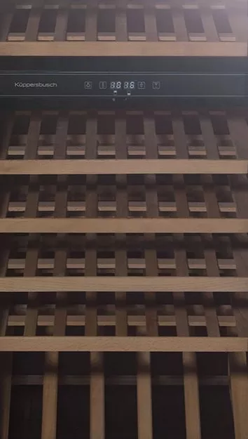 Встраиваемый винный шкаф Kuppersbusch FWK 4800.0 S2 из премиальной серии K.8 — это вместительное и технологичное решение для хранения и созревания вин, сочетающее элегантный дизайн и передовые технологии. Модель выполнена в черном стекле с дизайном Black Chrome (черный хром), что придает ей сдержанный и современный вид. Вместимость составляет 79 бутылок, размещенных на 9 деревянных полках. Электронная система управления с цифровым дисплеем и нажимными кнопками обеспечивает точный контроль температуры в диапазоне 5–18 °C в двух независимых отделениях. Инновационная система охлаждения с динамической циркуляцией воздуха гарантирует равномерное распределение температуры и влажности по всему объему. Резервуар для воды обеспечивает дополнительное увлажнение, создавая идеальные условия для длительного хранения вин. LED-освещение деликатно подсвечивает коллекцию без нагрева. Шкаф оснащен полным набором сигнализаций: звуковой сигнал, световая индикация аварии, индикация температуры внутри и снаружи. Изменяемая навеска двери (угол открывания 90°) позволяет адаптировать установку под планировку. Низкий уровень шума 39 дБ обеспечивает комфортную эксплуатацию . Производство — бренд из Германии.